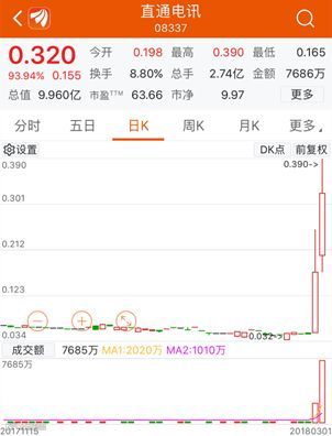 不走“佛系”路线,港股新晋“妖王”诞生,直通电讯(08337.HK)周三获港交所推翻“取消上市”决定(俗称“保壳”),公司股价从周三前收价0.041港元最高上涨至周四早盘的0.39港元,最高涨幅近9倍。