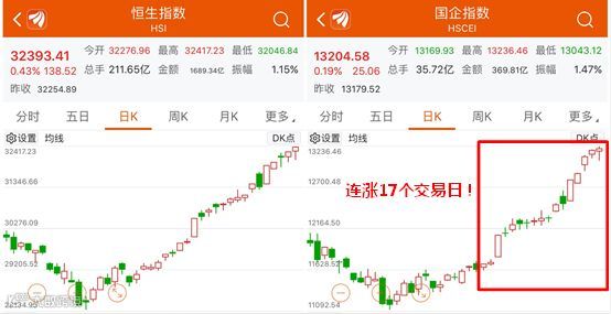 在全球各大指数屡创新高的环境中,国企指数目前市盈率为9.3倍可以说是极低的。在恒指已经突破07年历史高点的同时,国企指数的低估值优势开始显现,从下方周线图中可以看到国指已脱离现有运行通道,进入加速上涨期。国企指数17连涨期间累计涨幅为13.66%,恒生指数同期上涨9.45%,A股上证50指数同期上涨10.24%。20日,互联互通渠道南向资金连续第3天大幅流入超60亿元,从成交额占比更高的沪港通渠道来看,南向资金在下跌时大幅布局AH价差仍较大的金融板块,有望推动低估值的国指延续加速补涨的趋势。