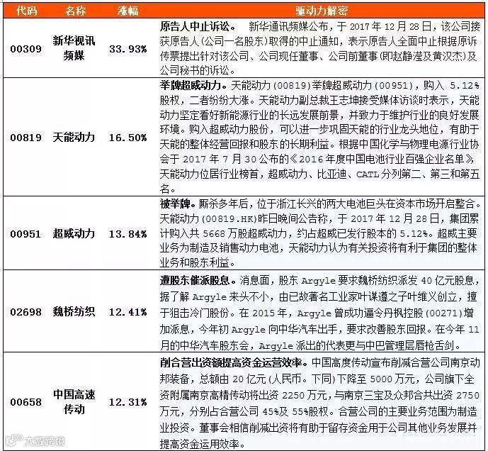 【天能动力举牌超威动力】天能动力(00819)举牌超威动力(00951),购入5.12%股权,二者纷纷大涨。天能动力副总裁王志坤接受媒体访谈时表示,天能动力坚定看好新能源行业的长远发展前景,并致力于维护行业的良好发展环境。购入超威动力股份,可以进一步巩固天能的行业龙头地位,有助于天能的整体经营回报和股东的长期利益。