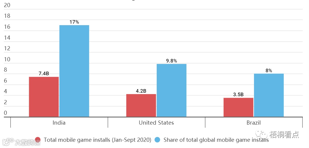 根据Sensor Tower报告的一项研究,美国在2020年的前9个月中按手机游戏下载量排名第二。美国用户的游戏安装量总计为42亿,占全球总数的9.8%。巴西排名世界第三,下载量为35亿,占比8%。