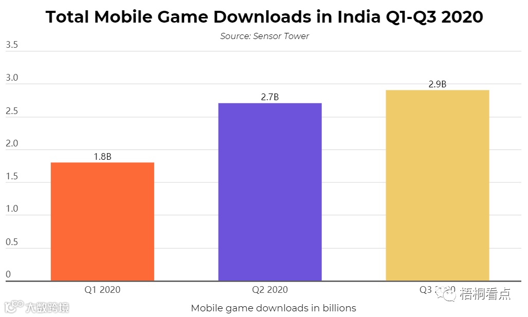 2020年第一季度,印度用户安装了18亿个应用。到2020年第二季度,由于印度人在疫情隔离期间被困在室内,这一数字猛增了50%,达到27亿。到2020年第三季度,这一数字进一步增长7%,达到29亿。