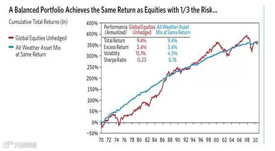 1996年,公司发行“全天候(All Weather)”对冲基金,并于1996年开创性地运用风险平价管理投资组合。All Weather,听上去是无论什么市场环境,都可以收获较高的风险调整收益?