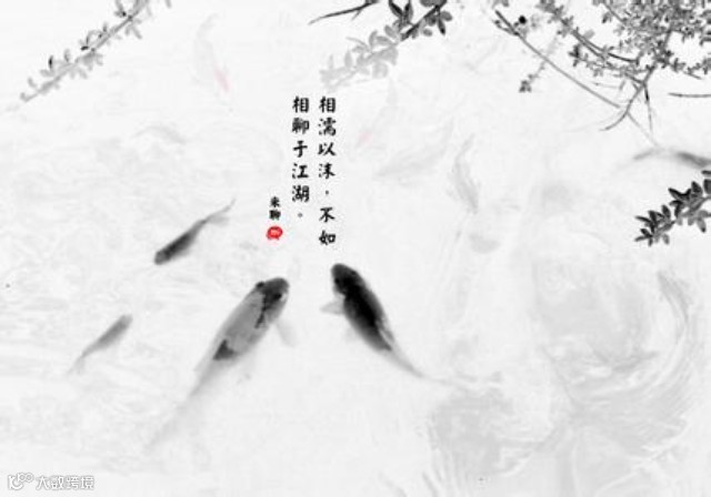 释义:泉水干涸了, 两条鱼为了生存, 彼此用嘴里的湿气来喂对方, 苟延残喘。但与其在死亡边缘才这样互相扶持, 还不如大家安安定定地回到大海, 互不相识的来得好