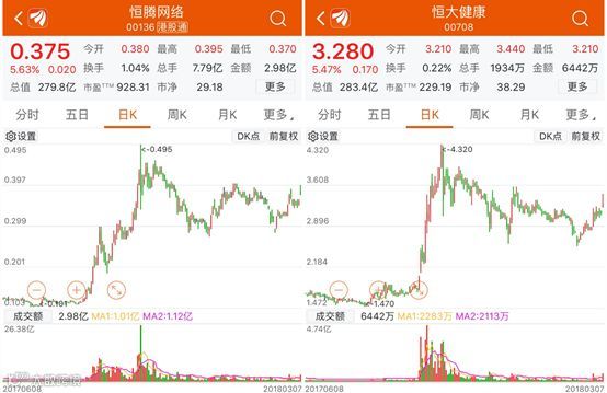 两家恒大系新兴企业恒腾网络(00136.HK)、恒大健康(00708.HK)公布17年业绩预告,基于较低的前期业绩,两家公司均公告数倍预增业绩。恒腾网络(00136.HK)是恒大集团携手腾讯(00700.HK)进军互联网社区服务产业的旗舰公司,公司17年纯利增19倍,主要由于互联网社区家居业务的迅猛发展,及新发展的互联网材料物流业务的贡献,公司股价周三收涨5.63%。恒大健康(00708.HK)是恒大集团旗下集新型高端国际医院、社区健康管理服务等业务为一体的综合大型健康产业集团,17年业绩预增4至5倍,利润大幅增长主要由于养生谷健康会员体系不断完善、会员数目大幅增加,销售养生空间的收入大增,公司股价周三收涨5.47%。