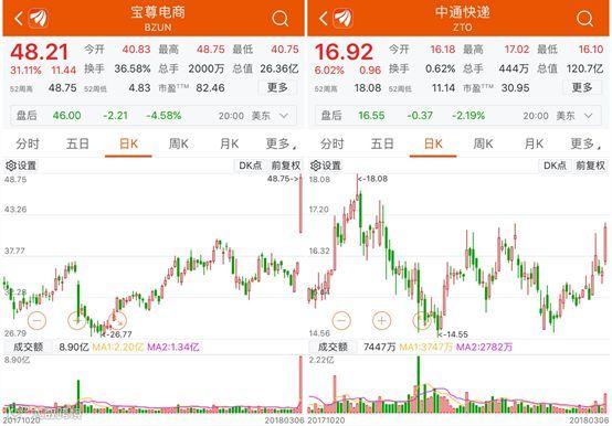 同属电商产业链的物流企业百世(BSTI)、中通快递(ZTO)周二分别上涨5.84%、6.02%。百世集团3月2日公布17年业绩,收入近200亿元,增长126%,净亏损大幅收窄。中通快递预计将于3月8日盘后发布17年业绩。
