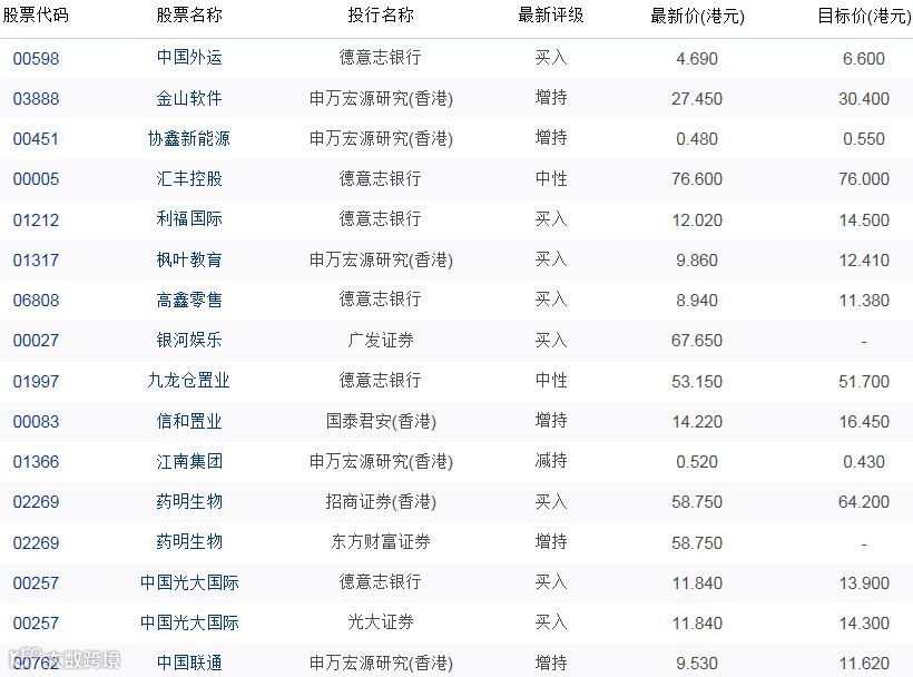 导读:最新港股机构评级