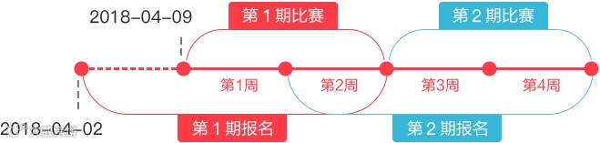 本次比赛历时9个月,2018年4月2日开始首期预报名,2018年4月9日-12月28日为正式比赛时间,每两周为一个赛期,每期开赛前需重新报名,每赛期进行独立排名和派奖,先报名先拿奖。
