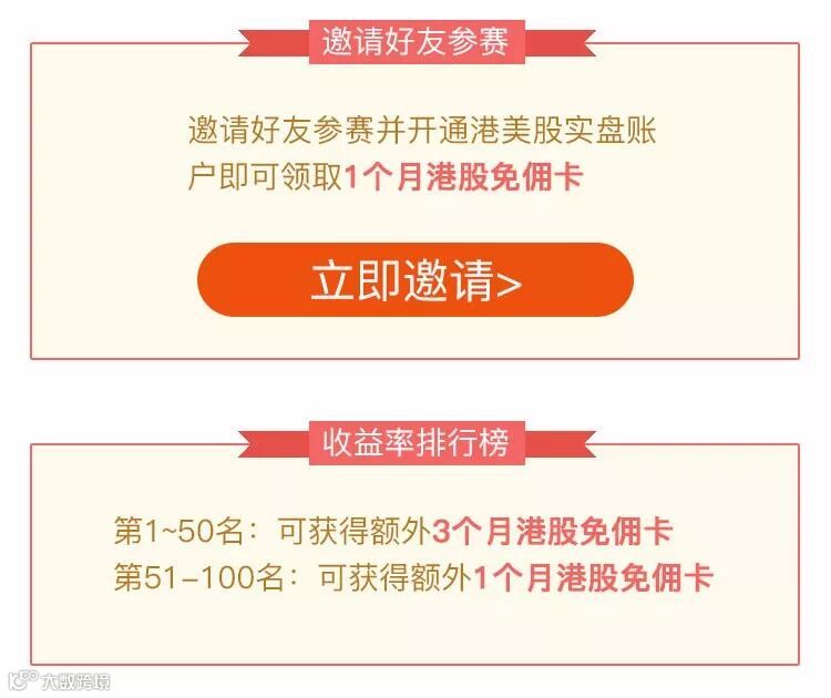 除了设置榜单提现外,本次大赛还特别增加了额外福利项,对于排名靠前的100名用户额外赠送港股免佣卡,同时设置邀请好友奖励。