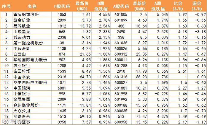 AH股当日走势排行前20名