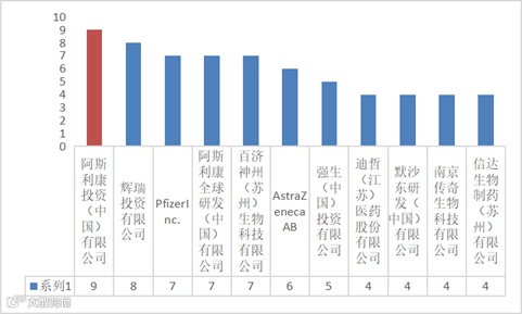 2025年9月,国合申报获批申办方共计91家,分布于我国9个省、自治区、直辖市,其中上海市申报项目最多,共计62项(35.23%),其次为江苏省和北京市,申报项目分别为33项(18.75%)、13项(7.39%)。阿斯利康投资(中国)有限公司申报项目最多,为9项,其次为辉瑞投资有限公司和PfizerInc.,分别为8项和7项。