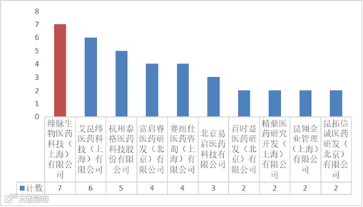 2025年9月,国合获批参与项目的CRO单位共计28家,分布于我国6个省、自治区、直辖市,其中上海市参与申报项目最多,为27项(49.09%),其次为北京市和浙江省,申报项目分别为17项(30.91%)和8项(14.55%);缔脉生物医药科技(上海)有限公司开展项目最多,为7项;其次为艾昆纬医药科技(上海)有限公司、杭州泰格医药科技股份有限公司,分别为6项和5项。