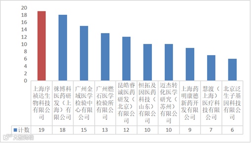 2025年9月,国合获批参与项目的第三方实验室共计89家,分布于我国9个省、自治区、直辖市,其中上海市第三方实验室参与的项目最多,共计89项(35.60%),其次为广东省和北京市,分别为42项(16.80%)和37项(14.80%)。上海序祯达生物科技有限公司开展项目最多,为19项;其次徕博科医药研发(上海)有限公司和广州金域医学检验中心有限公司,分别为18项和15项。