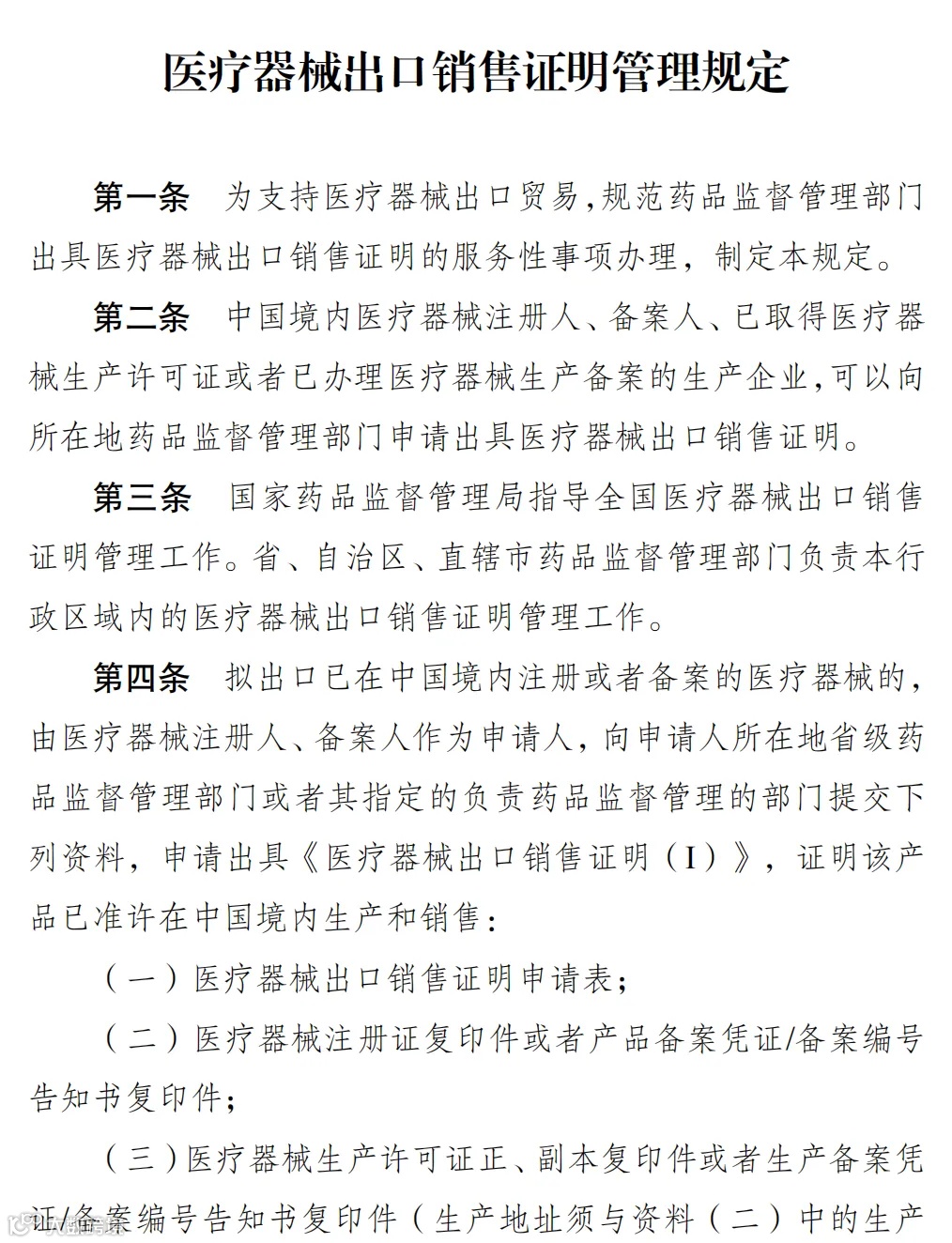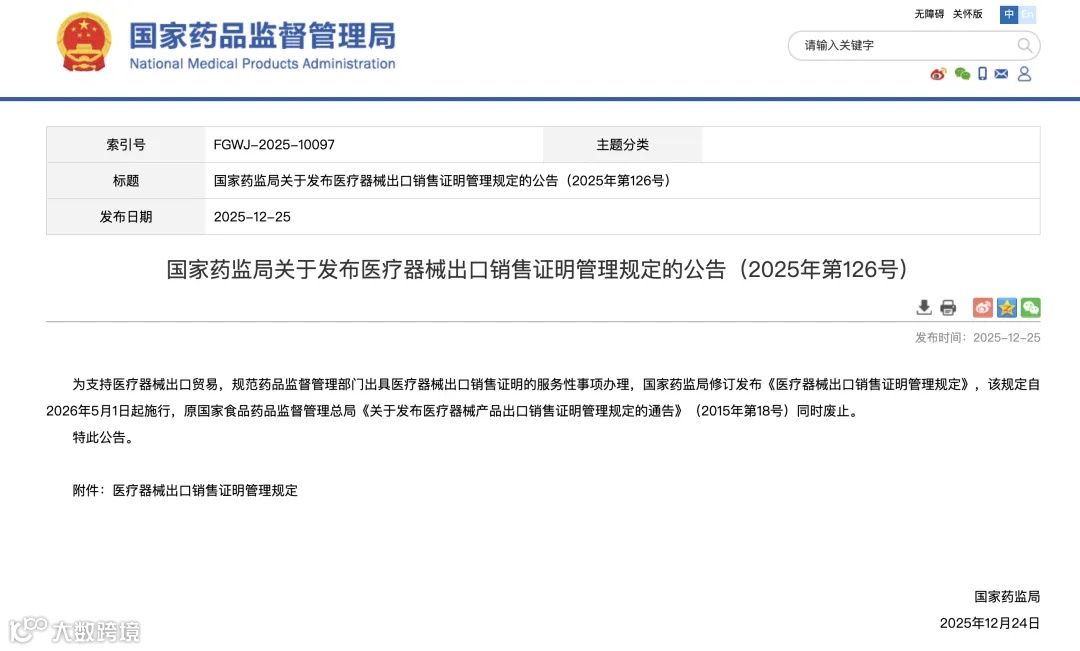 12月25日,国家药监局发布《医疗器械出口销售证明管理规定》(以下简称《规定》)。《规定》将于2026年5月1日起施行。