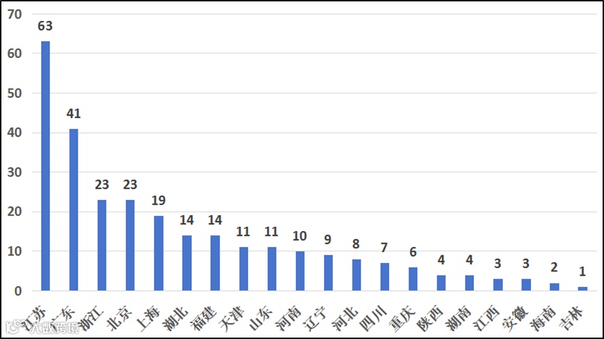 2025年9月,全国共批准注册276个境内第三类医疗器械产品,覆盖国内20个省市(不含港澳台),整体呈现出区域高度集聚的分布特征。其中,江苏省注册63个产品,位居全国首位,占比22.83%;广东以41个注册产品位居第二,其次是浙江和北京,均注册了23个产品并列第三。上海以19个注册产品排名第四,占比6.88%,注册数量较上月略有减少。与8月相比,江苏、广东、北京、浙江和上海的排名稳居前五位。整体来看,排名前五(不含并列)的省市共计注册169个产品,占全国总数的61.23%。这显示出长三角及珠三角地区在医疗器械产业发展中依旧保持强劲的创新与集聚优势。