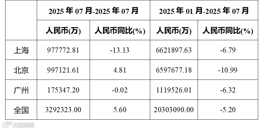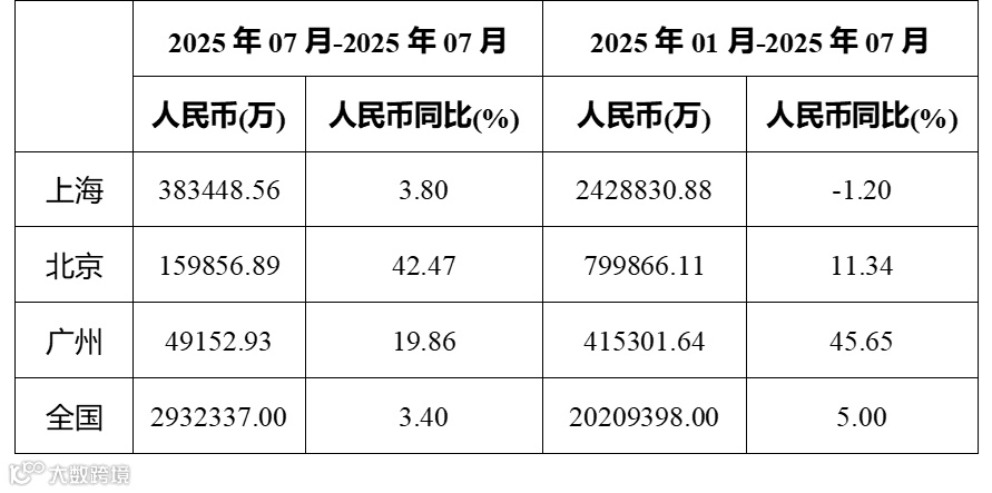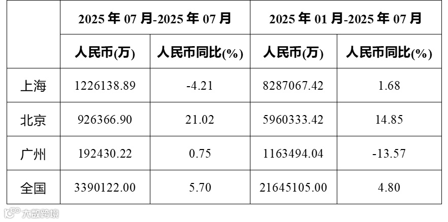 2025年7月,上海市生命科学技术出口总值达38.34亿元,较去年同期增长3.80%,占全国当月出口总值的13.08%,高于北京和广州。前7个月上海市生命科学技术出口总值累计达242.88亿元,较去年同期相比下降1.20%,占全国累计出口总值的12.02%,显著高于北京和广州。
