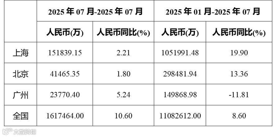 2025年7月,上海市医疗仪器及器械贸易出口总值14.69亿元,较去年同期增长14.24%,占全国当月出口总值的11.28%,高于北京和广州。前7个月上海市医疗仪器及器械贸易出口总值累计91.02亿元,较去年同期增长12.36%,占全国累计出口总值的10.96%,显著高于北京和广州。
