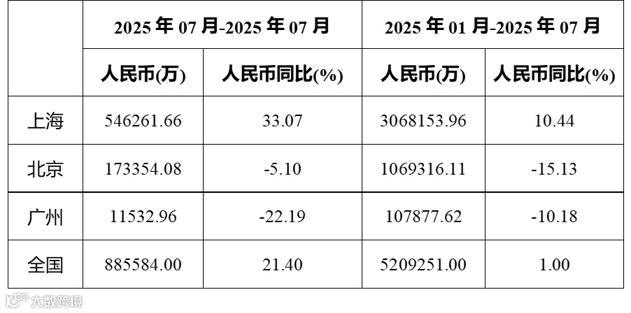 与此同时,2025年7月,上海市生命科学技术进口总值为122.61亿元,较去年同期下降4.21 %,占全国当月进口总值的36.17%,高于北京和广州。前7个月上海市生命科学技术进口总值累计达828.71亿元,较去年同期增长1.68 %,占全国累计进口总值的38.29%,高于北京和广州。