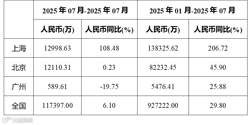 与此同时,2025年7月,上海市生物技术进口总值为7.03亿元,较去年同期增长39.60%,占全国当月进口总值的11.12%,高于北京和广州。前7个月上海市生物技术进口总值累计达26.76亿元,较去年同期增长6.95%,占全国累计进口总值的10.91%,低于北京。
