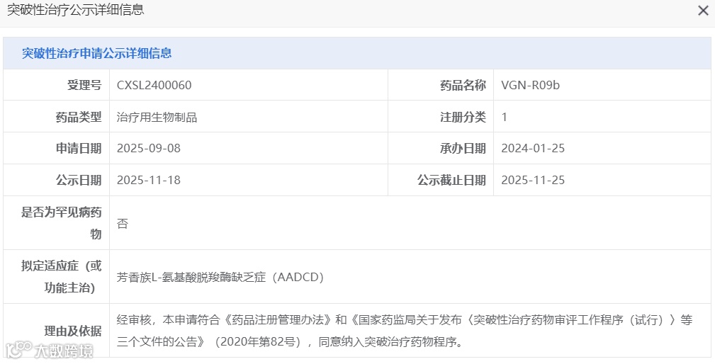 近日,CDE官网显示,上海天泽云泰生物的基因治疗药物VGN-R09b拟纳入突破性治疗品种,适应症为:芳香族L-氨基酸脱羧酶缺乏症(AADCD)。