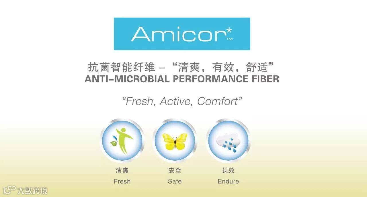 Amicor™抗菌、抗真菌纤维由日泰腈纶有限公司生产、销售。Amicor™所用的抗菌剂在纤维生产中,被注射入纤维内部,均匀分散并紧锁于纤维之中,而不是通过表面后整加入。纤维内部就像抗菌剂的储藏空间,在外表面磨损、损耗后由内部持续补充,耐水洗次数可达100次。拥有证书如下,英国抗过敏协会British Allergy Foundation证书, OEKO-TEX 100纺织协会证书 与REACH SVHC欧盟高度关注物证书。