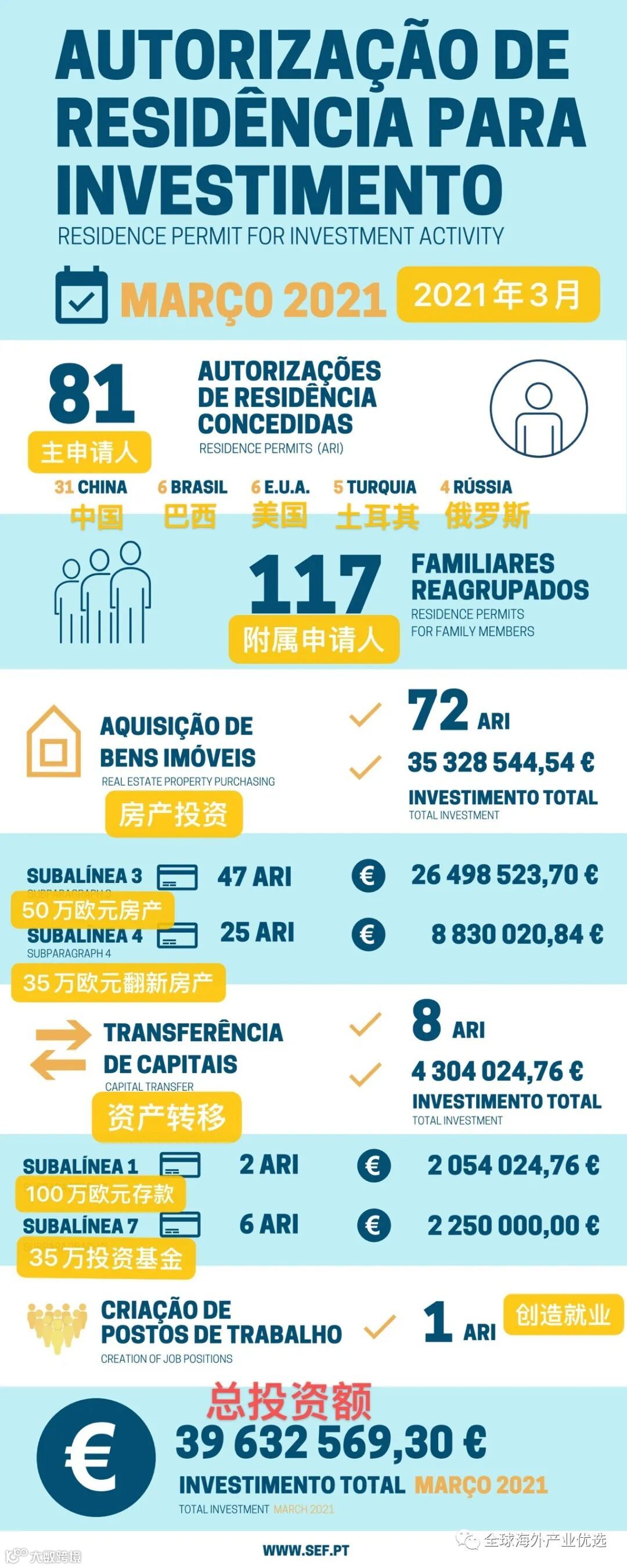 葡萄牙移民局发布2021年3月获批数据显示,全球主申请人81人,其中中国为31人,美国人为6人,附属申请人为117人。