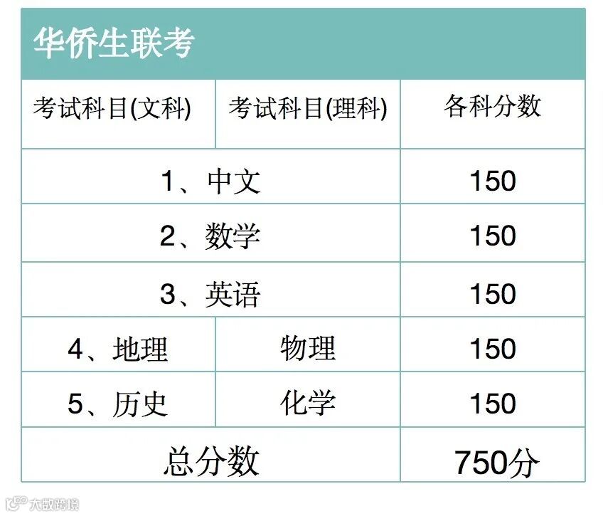 考试科目:高考及华侨生联考科目总分均为750分,唯一区别是华侨生联考文科不考政治,理科不考生物。