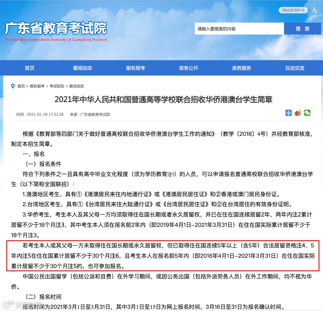 (未达到第一条标准)或考生本人及其父母一方均须取得住在国连续5年以上(含5年)合法居留资格,且报考前5年(2016年4月1日-2021年3月31日)累计居留不少于30个月。(出国留学或因公出国人员均不视为华侨)