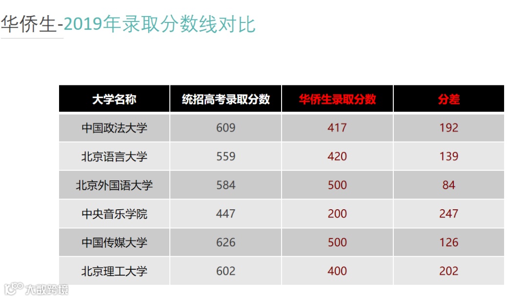 录取分数线:网上谣传华侨生联考400分上北大清华,这真是天大的误会,400分上不了北大,但是400分可以上中国政法大学、北京语言大学、中国传媒大学。最最重要的是,华侨生联考的考卷和高考考卷不一样,不仅科目少一门,难度更是比高考低了不止一个档次,华侨生联考主要以基础知识应用为主,知识点以高一初中为主。录取分数线低、考卷简单,毫不夸张地说,国内普通高三学生,填写华侨生联考这张考卷,轻轻松松就能答到500分,双优秀学校易如探囊取物。