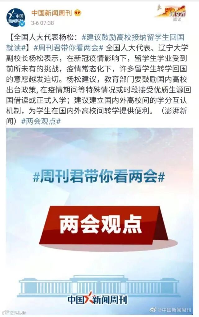 全国人大代表、辽宁大学副校长杨松表示,疫情常态化下,留学生转学回国的意愿越发迫切, 解决归国留学生学籍问题成为学籍管理工作中不可避免的问题。