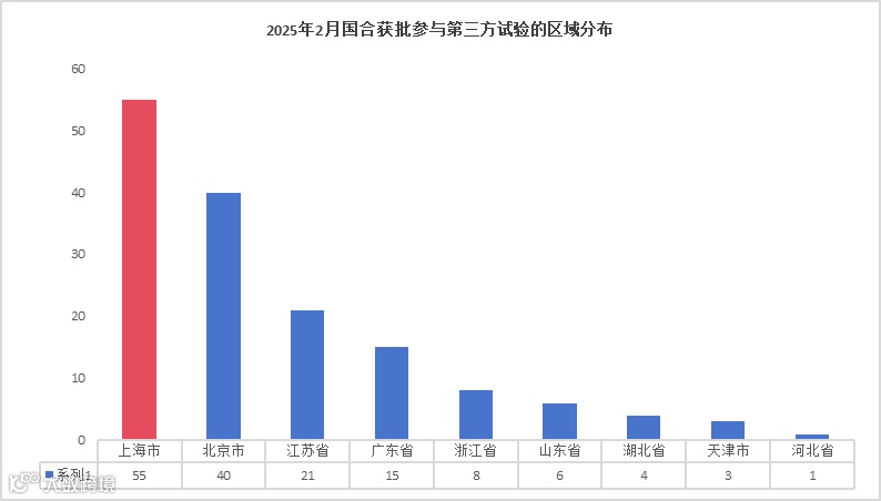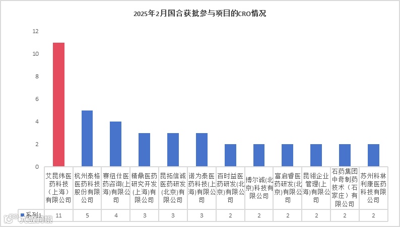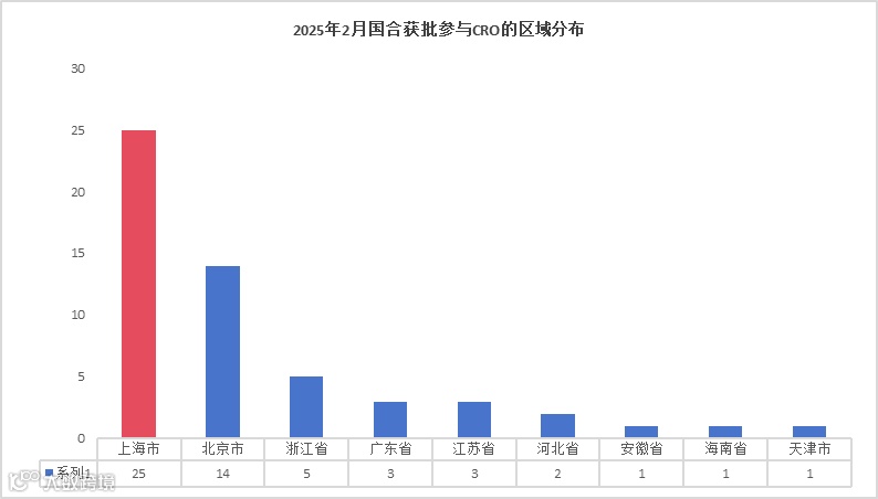 2025年2月,国合获批参与项目的CRO单位共计85家,分布于我国8个省、自治区、直辖市,其中上海市参与申报项目最多,为25项,其次为北京市和江苏省,申报项目分别为14项、5项;其中,艾昆纬医药科技(上海)有限公司开展项目最多,为12项;其次为艾昆纬医药科技(上海)有限公司和杭州泰格医药科技股份有限公司,分别为11项和5项。