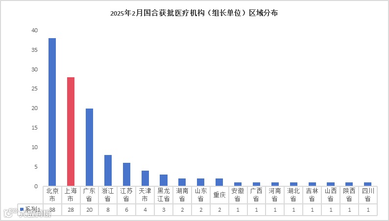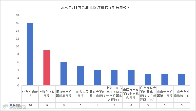 2025年2月,国合获批的医疗机构(组长单位)共计70家,分布于我国18个省、自治区、直辖市,其中,北京市申报项目最多,共计38项(31.45%),其次为上海市和广东省,申报项目分别为28项(23.1%)、20项(16.5%);其中,北京肿瘤医院开展项目最多,为16项;其次为上海市胸科医院、复旦大学附属肿瘤医院,分别为9项和6项。