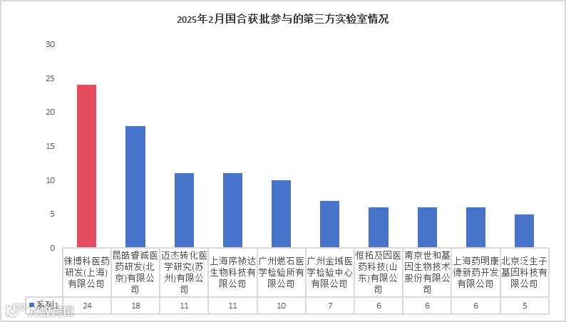 2025年2月,国合获批参与项目的第三方实验室共计66家,分布于我国9个省、自治区、直辖市,其中上海市第三方实验室参与的项目最多,共计55项,其次为北京市和江苏省,分别为40项和21项。其中,徕博科医药研发(上海)有限公司开展项目最多,为24项;其次,昆皓睿诚医药研发(北京)有限公司和迈杰转化医学研究(苏州)有限公司、上海序祯达生物科技有限公司,分别为18项和11项、11项。