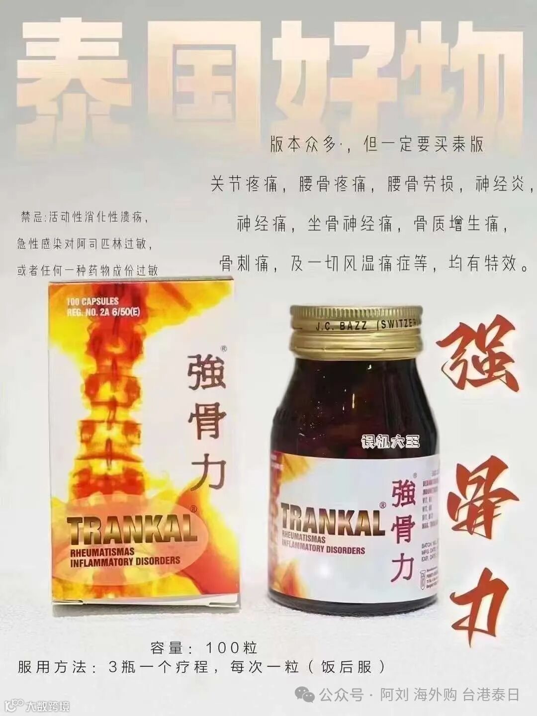 泰国强骨力拥有二种特效的消炎止痛成份,能迅速有效地消除一切风湿关节炎及所引起之红肿及发炎等。"强骨力"含有三谨高份量的维他命Bl、B6及B12。经医学实验证明,确能促进新陈代谢及血液循环之正常,对风湿,关节炎及神经痛症有极大帮助,再者"强骨力"更含有MAGNESIUM_TRISILICATE,它能有效地保护胃膜,使其它有效成份对胃部不会造成影响
