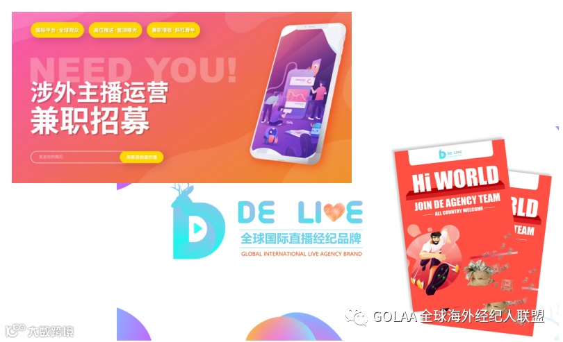 直播行业借助移动互联网大浪潮形成规模,满足人们的娱乐需求,与让人随时随地享受服务的移动互联网精神契合,同时秀场直播进入繁荣发展阶段。目前在海外开展直播业务的国内直播企业有近50家,地域遍布亚洲、欧洲、非洲、美洲和大洋洲的45个国家和地区。DE LIVE 全球国际直播经纪品牌是与众多海内外直播平深入合作,发挥DE国际集团丰富的涉外拓展经验与涉外资源的优势,进而挖掘、培养和发展海内外主播,让DE LIVE的各国主播向全世界通过直播途径展示不同国家不同人群的文化、才艺、旅游、商贸等。促进个人成长发展、促进跨国文化交流、促进国际融合。