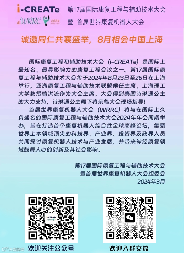 2024国际康复工程与辅助技术大会(i-CREATe2024)暨首届世界康复机器人大会(WRRC 2024)将于2024年8月23日-26日在上海召开。大会将汇聚来自哈佛、牛津、帝国理工、麻省理工、哥伦比亚、瑞士联邦理工等20多所国际顶尖高校以及国内50多所知名高校的专家学者,云集国内外的知名企业家、国际组织代表等100余位重量级嘉宾。今天发布确认出席大会海外专家第二辑(第一辑点这里)。