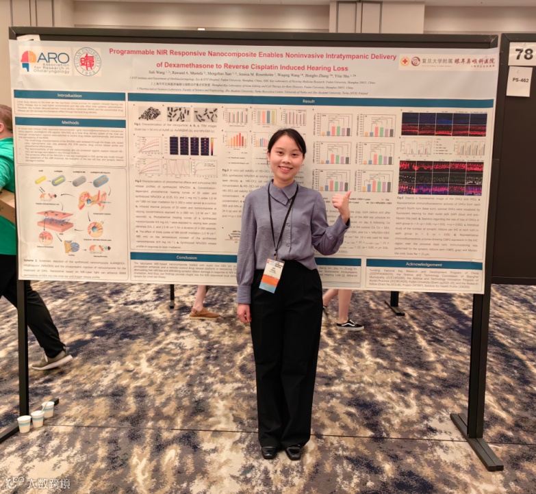 王家莉博士展示了关于程序化近红外响应纳米复合材料促地塞米松鼓室注射拮抗顺铂耳毒性的研究成果,该研究通过鼓室注射近红外响应型纳米复合体,程序化递送地塞米松透圆窗膜释放,高效改善顺铂诱导的听力损失,并获得Travel Award资助。