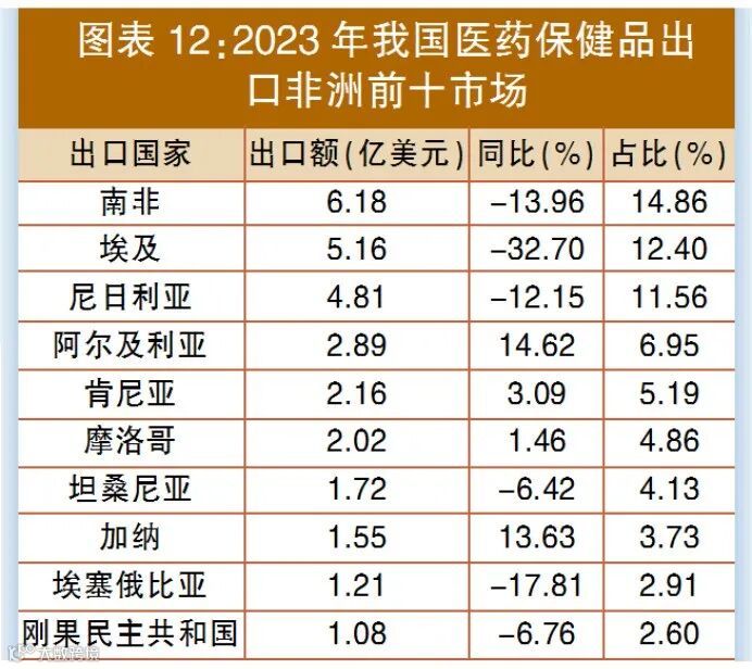 2023年,中国在非洲市场医药产品进出口贸易额为42.68亿美元,同比下降11.36%,其中进口额1.08亿美元,同比下降0.98%;出口额41.6亿美元,同比下降11.61%(见图表12)。