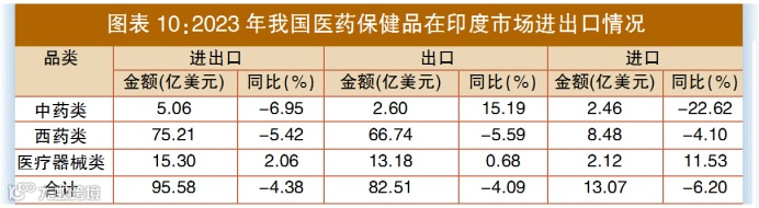 2023年,中国在印度市场医药产品进出口贸易额95.58亿美元,同比下降4.38%,其中进口额13.07亿美元,同比下降6.2%;出口额82.51亿美元,同比下降4.09%。