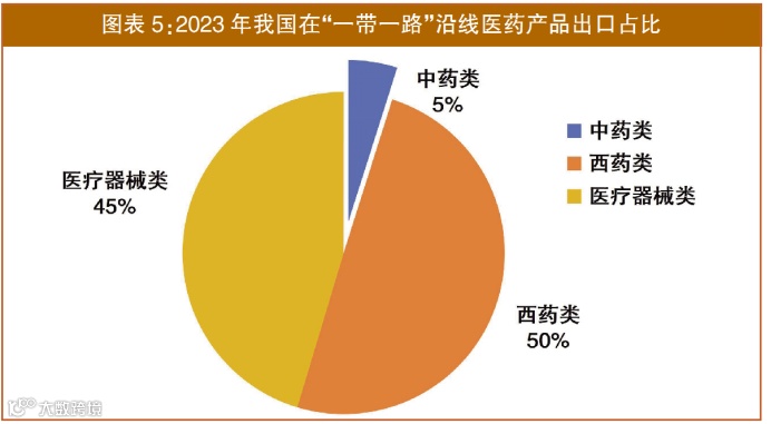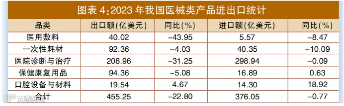 医疗器械类产品出口占我国医药外贸市场总额的44.61%。2023年,双边贸易额为831.3亿美元,同比下降14.18%,其中出口额为455.25亿美元,同比下降22.8%;进口额为376.05亿美元,同比下降0.77%(见图表4)。