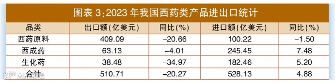 2023年,我国西药类产品出口金额占我国医药出口总额的50.04%。西药类产品出口额为510.71亿美元,同比下降20.27%;进口额为528.13亿美元,同比增长4.88%。