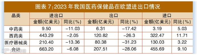 2023年,中国在欧盟市场医药产品进出口贸易额为663.2亿美元,同比下降6.08%,其中进口额455.69亿美元,同比增长9.1%;出口额207.51亿美元,同比下降28.06%。
