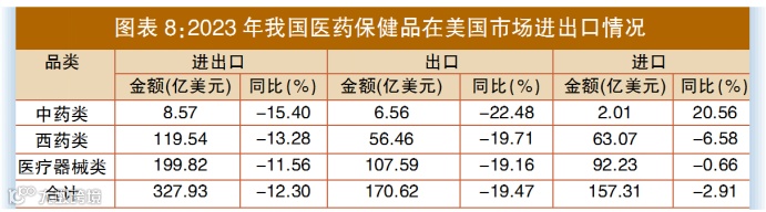 2023年,中国在美国市场医药产品进出口贸易额为327.93亿美元,同比下降12.3%,其中进口额157.31亿美元,同比下降2.91%;出口额170.62亿美元,同比下降19.47%。