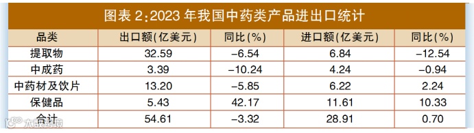 2023年,我国中药类产品出口额为54.61亿美元,同比下降3.32%;进口额为28.91亿美元,同比增长0.7%。从细分产品看,占比最多的中药提取物出口额为32.59亿美元,同比下降6.54%;中药材及饮片出口额13.2亿美元,同比下降5.85%;中成药出口额3.39亿美元,同比下降10.24%;中药类保健品则大放异彩,出口额达5.43亿美元,创下同比42.17%的增长率(见图表2)。