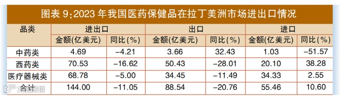 2023年,中国在拉丁美洲市场医药产品进出口贸易额144.0亿美元,同比下降11.05%,其中进口额55.46亿美元,同比增长10.6%;出口额88.54亿美元,同比下降20.76%。