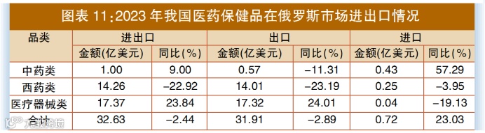 2023年,中国在俄罗斯市场医药产品进出口贸易额32.63亿美元,同比下降2.44%,其中进口额0.72亿美元,同比增长23.03%;出口额31.91亿美元,同比下降2.89%。其中,中药类产品出口额0.57亿美元,同比下降11.31%;进口额0.43亿美元,同比增长57.29%。西药类产品出口额14.01亿美元,同比下降23.19%;进口额0.25亿美元,同比下降3.95%。医疗器械类产品出口额17.32亿美元,同比增长24.01%;进口额0.04亿美元,同比下降19.13%(见图表11)。