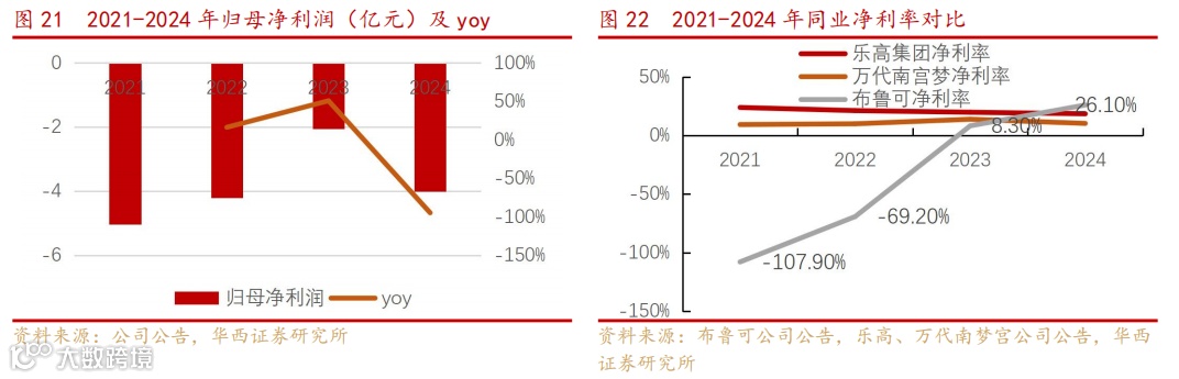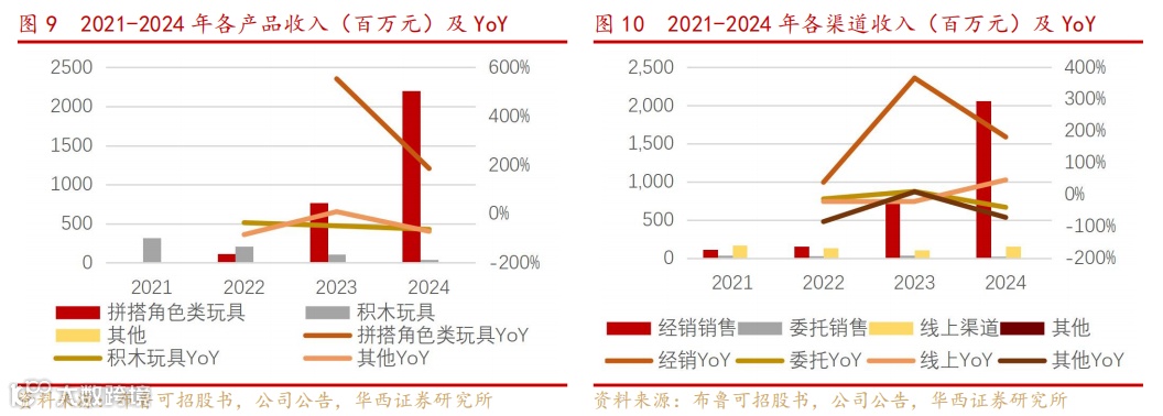 2021-2024年公司收入CAGR为89%,得益于拼搭角色类玩具的增长,和经销渠道的快速扩张。2021-2024年,公司收入分别为3.3、3.3、8.8、22.4亿元,2023年、2024年同比增速分别为169%、156%。