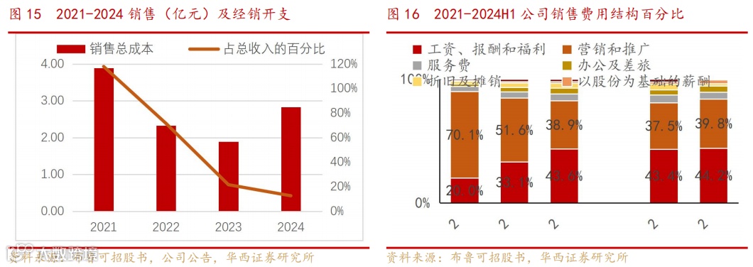 销售及营销费用占总收入的比例不断降低。2021年至2024年,公司销售及营销费用分别为3.89亿元、2.33元、1.89以及2.83亿元亿元,占同期总收入的比例分别为117.9%、71.5%、21.6%以及12.6%,公司前期在市场营销方面投入较大。在2021年以高成本获取市场后,公司通过削减不必要的开支来改善财务状况。而从后续可以看出,布鲁可在销售费用中的大幅压缩(尤其是营销推广的投入比例)表明公司从高投入推广逐步向更精细化运营转变。
