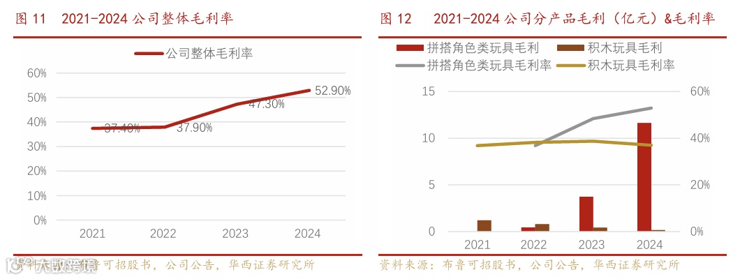 代工生产规模化压缩成本,毛利率从2021年37.4%升至2024年52.9%。公司采用标准零件与特征零件组合设计:标准零件用于玩具结构及关节,跨产品通用,既通过拼搭与混搭创作提升用户互动体验,又借助标准化生产实现规模效应并保障质量稳定;特征零件专注外观设计,精准还原 IP 角色的视觉特征与叙事元素,强化产品 IP 还原度。