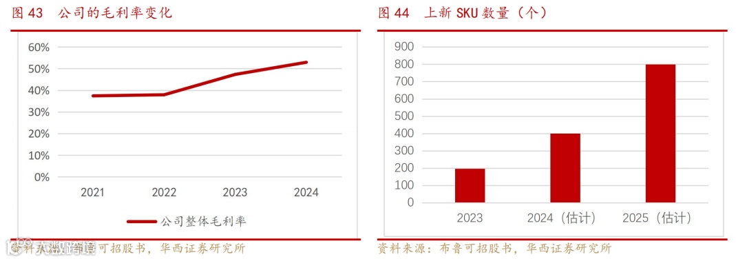 标准化结构+柔性供应链,缩短上新周期。产品设计与开发过程分为3个阶段,概念探索阶段、结构设计阶段、产品原型及DFM阶段。新品研发周期仅6–7个月(行业平均10–12个月),2023年推出197款SKU。并计划2024年和2025年分别推出约400款和约800款SKU。