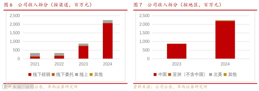 从渠道结构来看,经销渠道的快速扩张是收入增长的主要原因,2023、2024年经销渠道收入分别为7.3、20.6亿元,同比增速分别为367%、182%,截至2024H1公司有511个经销商。对比以经销渠道为主的卡牌潮玩卡游,截至2024年,卡游的经销商数量为217个。